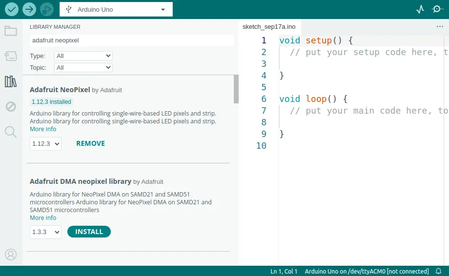 Para probar se puede cargar el ejemplo Strandtest de la librería de Neopixel. Solamente hay que modificar el Pin al que conectamos los datos de los leds y el numero de leds que vamos a controlar.
