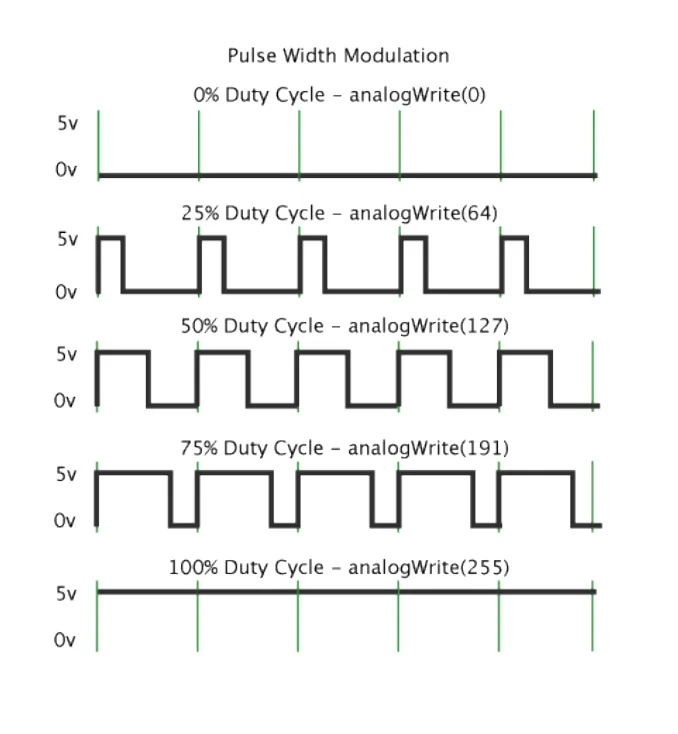 Como el Arduino sólo puede tener dos valores posibles como outputs (LOW y HIGH) la única manera de emitir un valor análogo es alternar la salida entre LOW y HIGH a una velocidad suficientemente alta como para que no alcancemos a ver los cambios, y lo que vemos es el promedio de los dos valores.