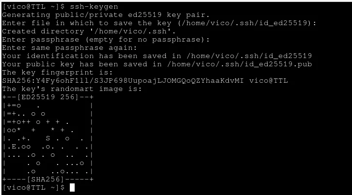 Esto generará un par de llaves y las guardará por defecto en la carpeta ~/.ssh, de ahora en adelante tenemos que cuidar nuestra llave privada, cualquiera con acceso a ella podría utilizarla para entrar en cualquier máquina donde estemos autorizados.
