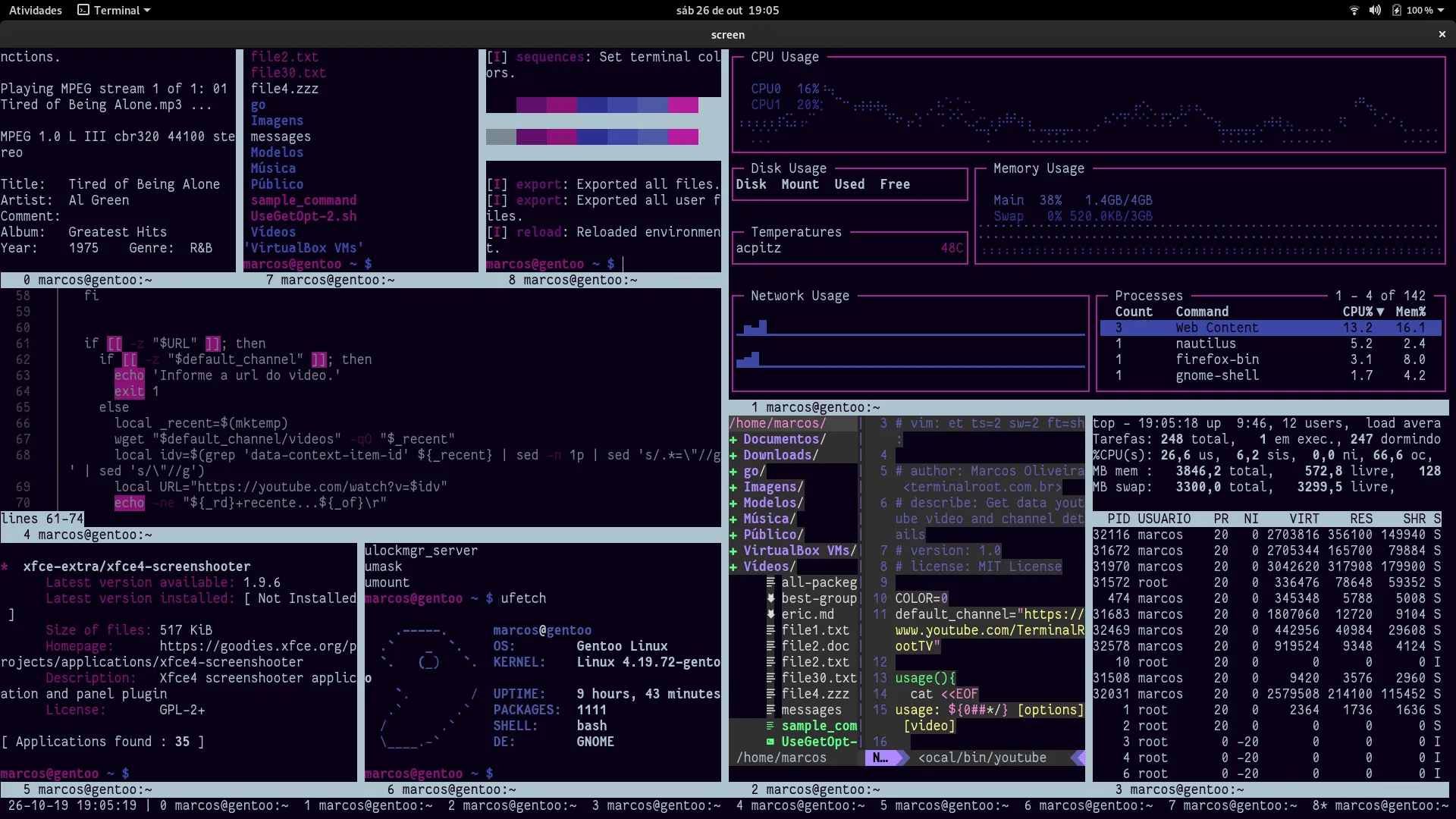 También podemos acceder a nuestro intérprete de shell a través de un programa de terminal dentro de nuestro ambiente gráfico. Hay muchas opciones diferentes y normalmente cada escritorio trae alguna instalada por defecto, en el arch wiki puedes encontrar una lista bastante larga, dentro de las más comunes están kitty o alacritty. Usar la terminal dentro del ambiente gráfico tiene algunas ventajas, como son más colores disponibles, emojis, o soporte para imágenes más accesible, entre otras.