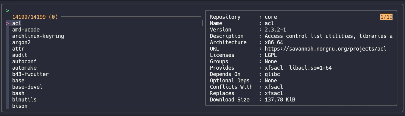 • pacman -Si {1}: genera la información para el preview del paquete donde tenemos el cursor.